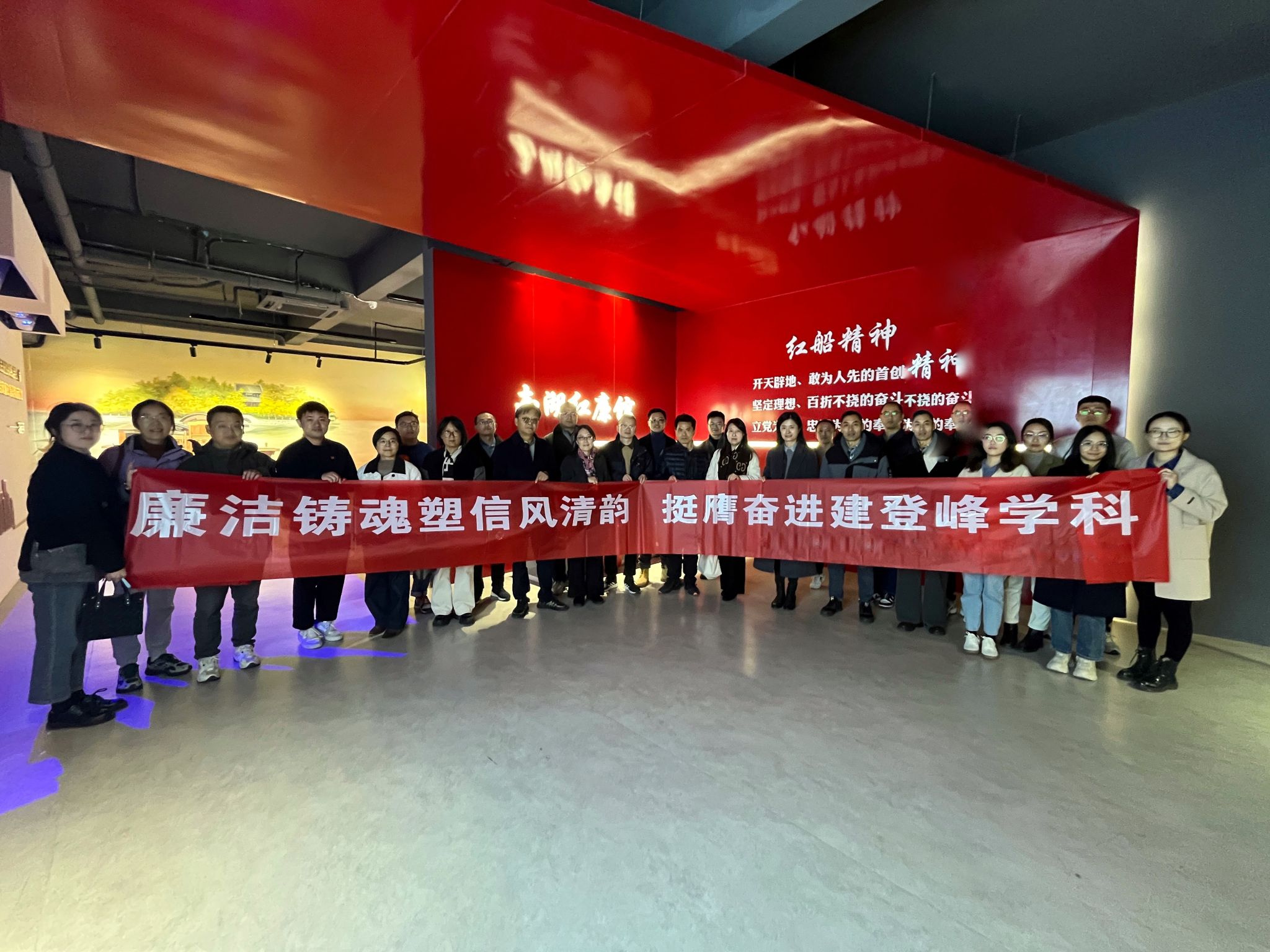 以嘉兴火车站复建后的1921站房为起点,大家了解了建党初期中共一大会议从筹备、开展到后续道路探索的相关,跟随中共一大代表们的脚步,行至狮子汇渡口,乘坐渡船前往湖心岛,瞻仰革命红船,聆听“一条小船和一个大党的故事”,感悟百年来中国共产党的初心使命,探寻薪火相传的伟大精神。为持续巩固深化党纪学习教育成果,老师们走进南湖红廉馆开展廉政警示教育,以廉洁文化涵养清风正气。